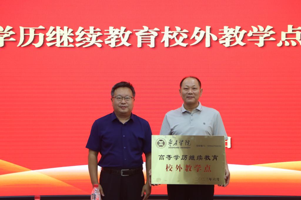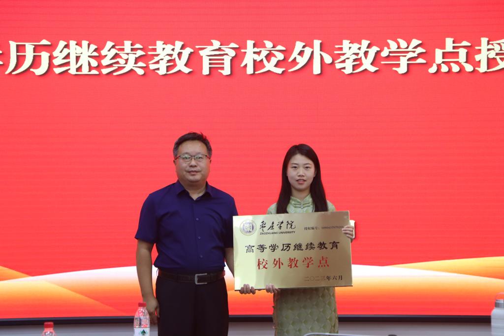 丰雷为校外教学点颁发best365官网进行授权并编号的高等学历继续教育校外教学点牌匾并合影留念。