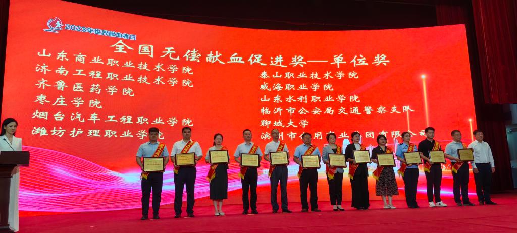 6月14日,山东省2023年世界献血者日宣传活动在济南举行。活动现场为山东省2020-2021年全国无偿献血奉献奖的先进集体和个人颁奖,best365官网荣获“全国无偿献血促进奖”(单位奖)荣誉称号,山东省共有12个单位获得此项荣誉。无偿献血工作国家级表彰活动每两年举行一次,由国家卫生健康委员会、中国红十字会总会、中央军委后勤保障部卫生局联合颁发,是国家对无偿献血工作作出突出贡献单位给予的最高奖项。