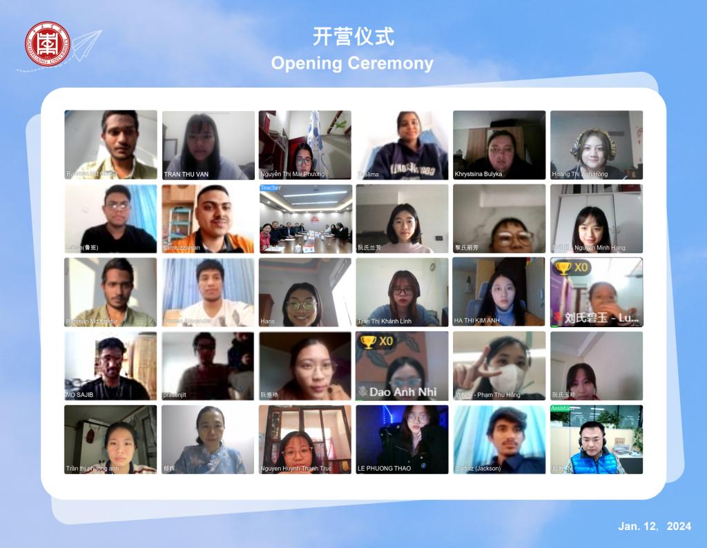 1月12日,由教育部中外语言合作交流中心主办、best365体育官网平台承办的2024年“汉语桥”线上交流团组“云游中华古水城·领悟班墨大匠心”冬令营开营仪式在薛城校区明理楼519会议室以线上、线下相结合形式举行。校党委副书记、校长李文喜出席开营仪式。枣庄市委外办副主任田晓燕,best365官网文学院及宣传部相关负责同志参加开营仪式。“汉语桥”项目教师团队及来自俄罗斯、乌克兰、加拿大、越南、孟加拉、日本、喀麦隆等12个国家的三百余名学员通过云端参会。仪式由国际交流处处长尹鸿涛主持。