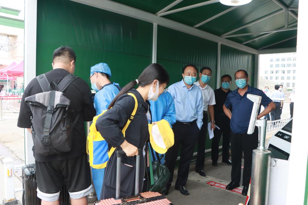8月28日,校领导曹胜强、丰雷、安涛、张昌林带队至报到现场迎接和慰问返校学生,向同学们送上亲切问候,并叮嘱学生要严格遵守疫情防控期间校园相关管理规定,加强个人防护意识,做好身体健康监测,做到防控、学习“两不误”。校领导仔细查看了返校报到点的工作情况,要求工作人员严格按照返校相关要求开展工作,服务好每一位学生,确保安全健康、平稳有序完成返校工作。办公室、学生工作处、后勤服务处、保卫处等部门负责同志陪同检查。