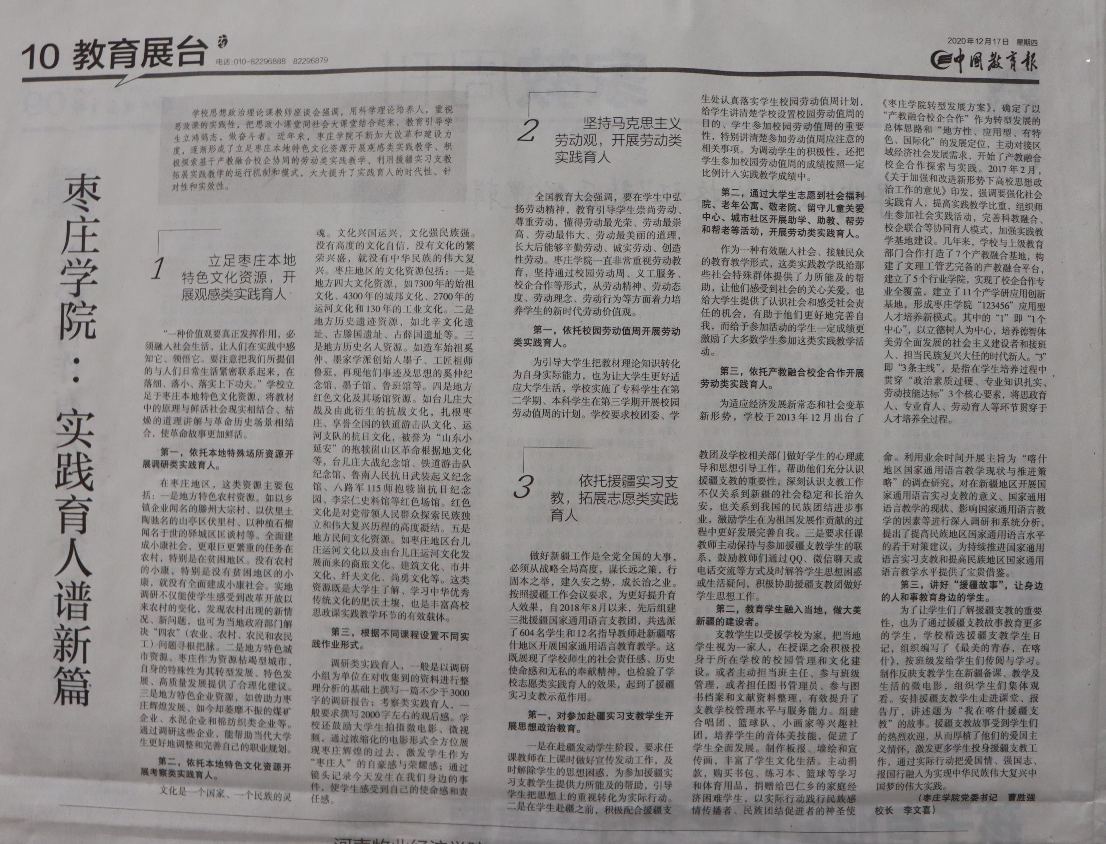 近日,《中国教育报》第10版刊发best365官网党委书记曹胜强、校长李文喜署名文章《best365体育官网平台:实践育人谱新篇》,从“立足枣庄本地特色文化资源,开展观感类实践育人”“坚持马克思主义劳动观,开展劳动类实践育人”“依托援疆实习支教,拓展志愿类实践育人”三个方面,全面介绍了best365官网实践育人开展情况及相关经验做法。