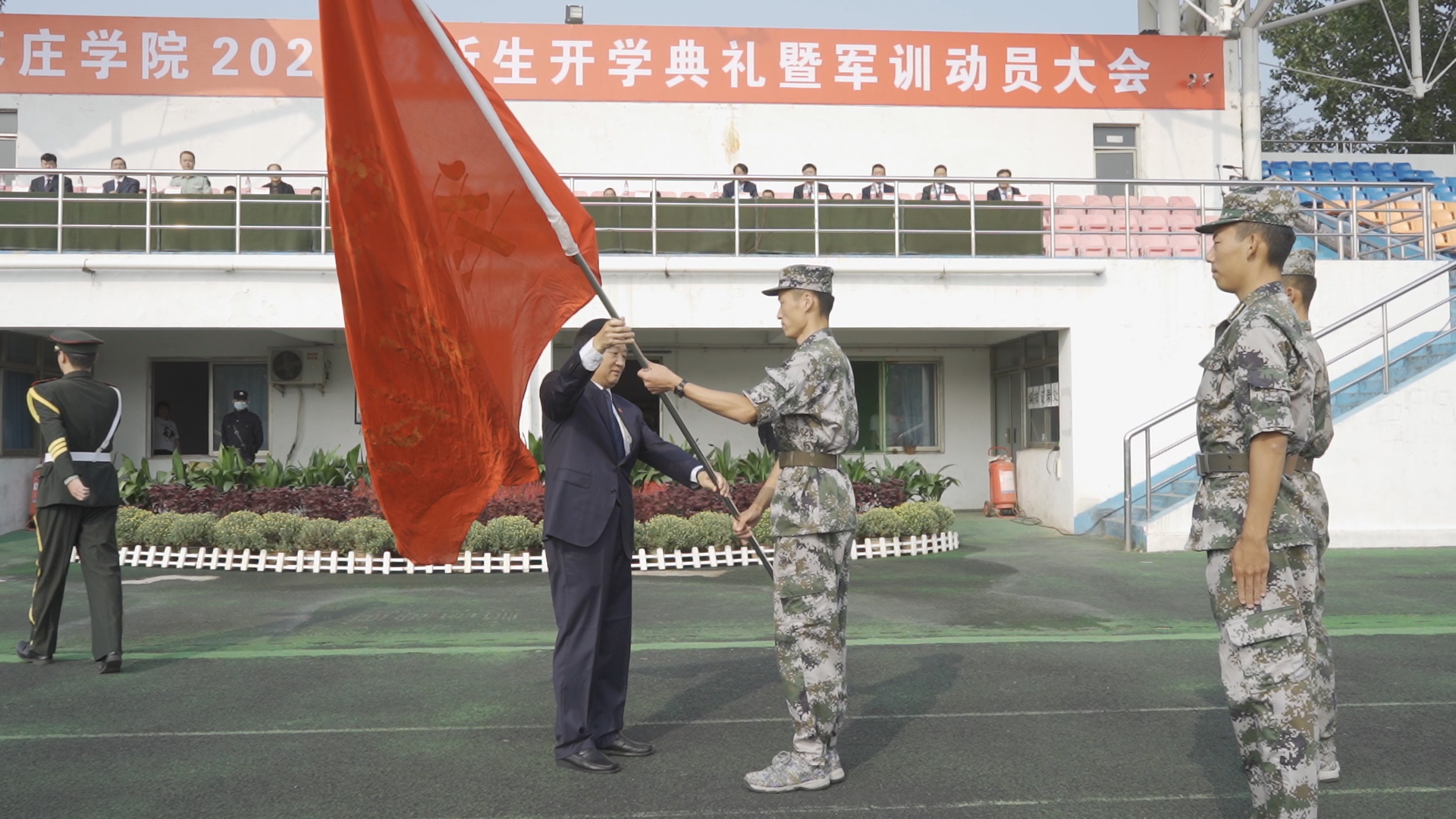 大会在庄严雄壮的国歌声中拉开帷幕,与会人员全体起立奏唱国歌。随后,校长李东为军训团授旗。