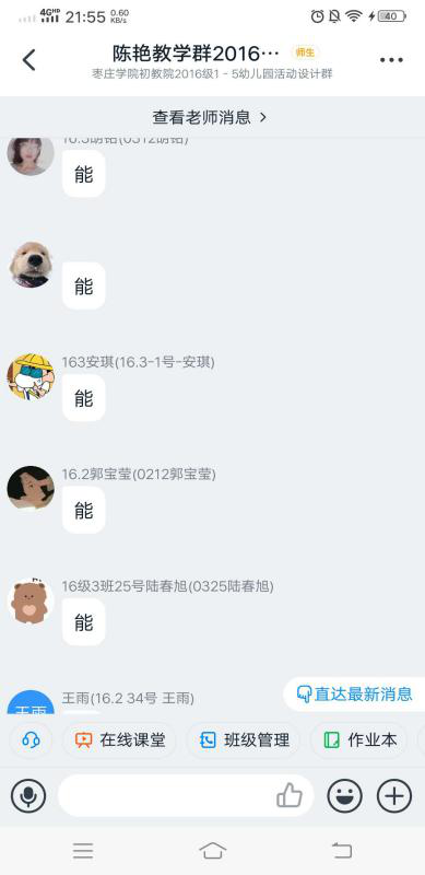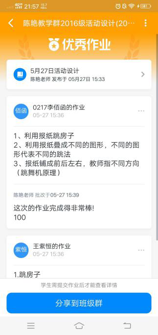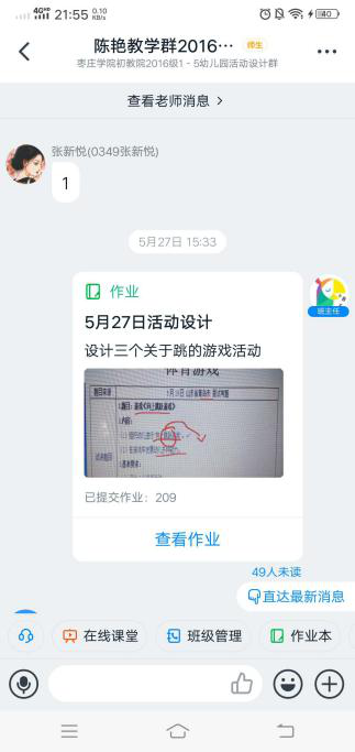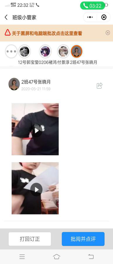 为了保证线上教学效果,提高教学效率,课堂上讲授的重点和难点,课后通过作业检验学习效果。陈老师通过多次实践选择小程序班级小管家,非常适合课程写-说-讲的要求,有利于学生学、练、用结合。教师发布不同形式的作业,学生可以拍照、录音、视频的方式上传,并能随时跟踪学生的作业完成情况。同时在微信班级群互动平台,及时发布课程相关信息,增进课程互动。教师全程在线答疑解惑,拓展课下教学空间,进一步巩固教学效果。