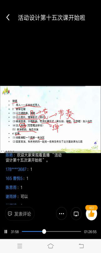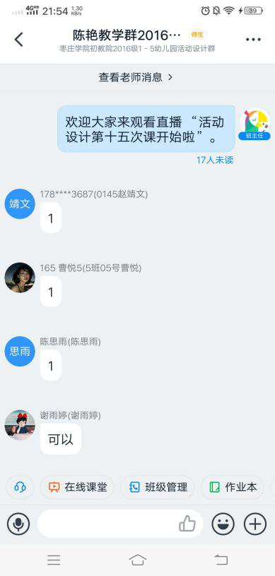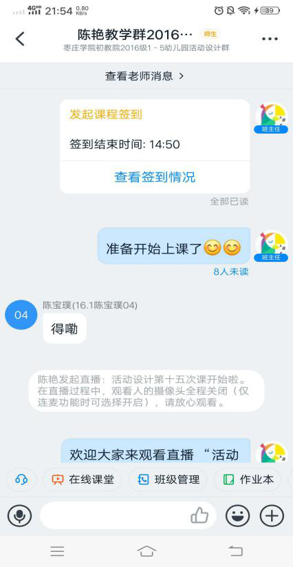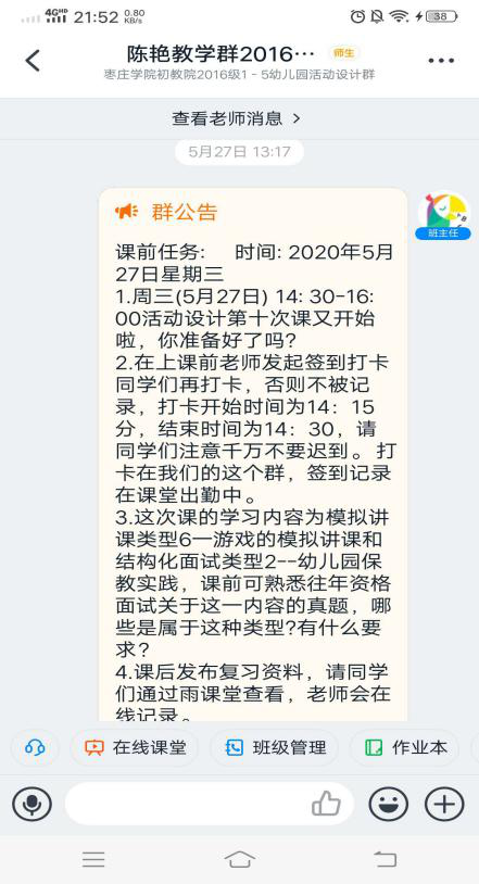 初等教育学院陈艳老师本学期承担了2016级1-5班《幼儿园教育活动设计》课程的教学任务,本课程兼有理论和实践的双重特点,一方面需要学生具备幼儿园课程的原理性实践性知识,另一方面需要学生联系其他技能性课程具备一定的教学能力和师德师范。为了使学生在理论学习的同时,能更好进行练习、实践,应用于幼儿园的实际教学,陈老师采用的线上教学形式是以直播为特征的混合式教学,选用的平台是“雨课堂+微信群+钉钉直播+班级小管家”,真正实现“优教、优学”,达到了良好的教学效果,具体可从课前、课中、课后三个环节来实施,最终实现线上教学师生互动有效,学生学习有效。具体如下: