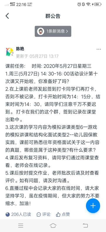 在课前发布群公告,告知学生上课时间和上课内容,同时介绍本节课的主要内容和学生要掌握的核心知识,需要学生准备什么,从而让学生有针对地进入课堂。并通过雨课堂平台发布预习课件,方便学生对授课内容进行初步认知,做好课前预热,带着问题进入直播课程。通过后台数据及时查看学生预习情况,对未观看的学生及时在微信群提醒。群公告具有统计阅读功能,方便老师明确已阅和未阅同学,对于未阅学生可以通过免费钉钉电话或短信告知,防止有的学生因忘记时间而错过上课,确保到课率。