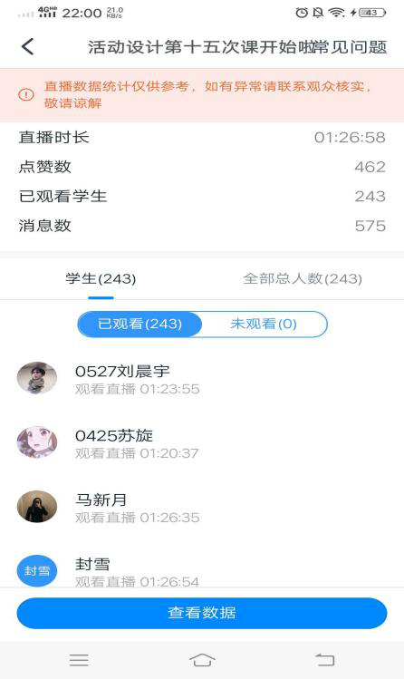 通过钉钉实时监测学生观看时长,不仅知道学生上课情况,还能更详细的了解学生上课多长,有助于教师掌握真实的上课情况。对于未观看的同学及时沟通,提醒学生通过观看预习课件、直播视频的方式补课并单独通过作业参加课后检测。
