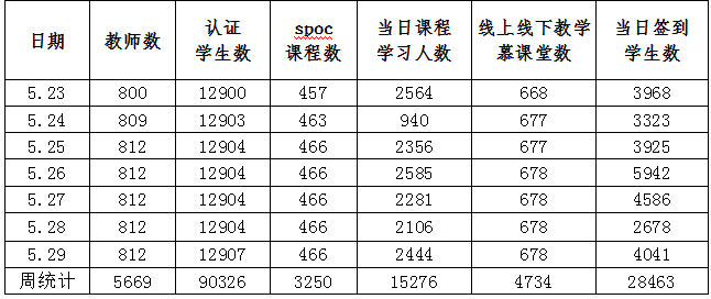 本周运行课程累计3250门次,上线教师数5669人次,认证学生数90326人次,当日课程学习累计15276人次,线上线下教学慕课堂数4734,当日签到学生数累计28463。