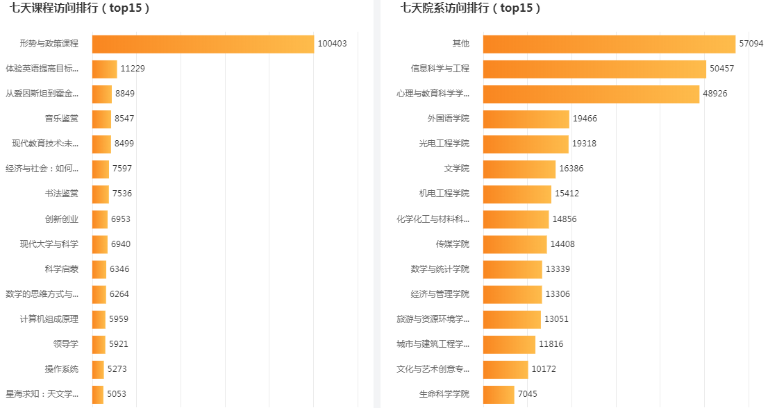 本周线上教学课程1057门、3015门次;参与授课教师809人,涉及教学班级2239个,学生学习人次数168039;累计上线学习学生人次数占累计应上线学习人次数比例为99.35%。