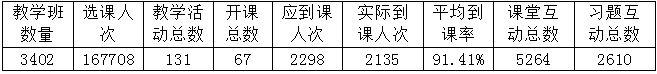 best365官网师生在雨课堂平台使用情况,根据大数据统计,由此查看本周教学班数量、教学活动总、开课总数、应到课人次、实际到课人次、课堂互动总数、平均到课率、习题互动总数,详情见下表: