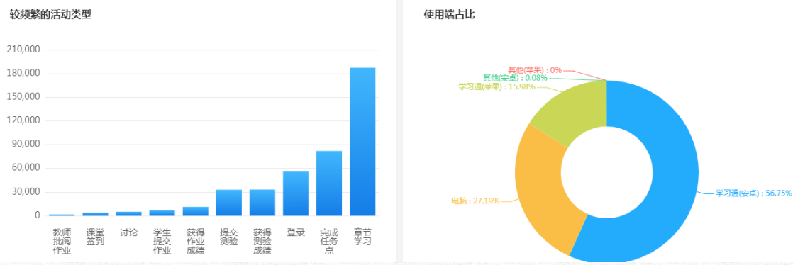 根据超星平台提供的大数据分析,可以查看本周课程打开次数、课程访问排行、较为频繁的活动类型、活跃度最高的院系和学习端口占比分别为: