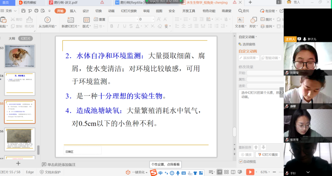地球表面60%的面积为湖泊、河流、海洋所覆盖,这些水体或碧波荡漾,或汹涌澎湃,或静谧自然,它们孕育了形态各异的水生生物,从肉眼看不见的微型藻类和浮游动物,到触手可及的虾蟹、赏心悦目的水生植物。为了能够给学生充分展示这多姿多彩的水生生物世界,展现生命的奥妙与神奇,陈老师通过腾讯会议,充分利用中国大学教学平台以及其它网络平台提供的各种教学视频进行讲解、提问、材料阅读、视频观看和回答问题、完成作业等。