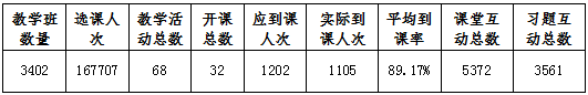 best365官网师生在雨课堂平台使用情况,根据大数据统计,由此查看本周教学班数量、教学活动总、开课总数、应到课人次、实际到课人次、课堂互动总数、平均到课率、习题互动总数,详情见下表: