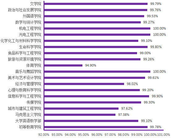 各院(部)的开课数、开课门次、班级数、教师数(人次)、学生数(人次)和学生上课率情况如下图所示:
