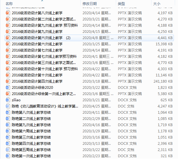陈艳老师承担2016级1至5班的《幼儿园教育活动设计》课程的教学任务,授课人数243人,每周授课学时90分钟。该课程是兼有理论和实践的双重特点,一方面需要学生具备幼儿园课程的原理性实践性知识,另一方面需要学生联系其他技能性课程并具备一定的教学能力和师德师范。