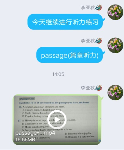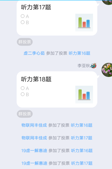 2.任课教师发布录制视频、课文内容和音频到QQ群,让学生观看学习,并在QQ群里提问、讨论、答疑。听力练习时,利用QQ投票功能让学生选择答案,了解学生的作答情况并有针对性地进行讲解。