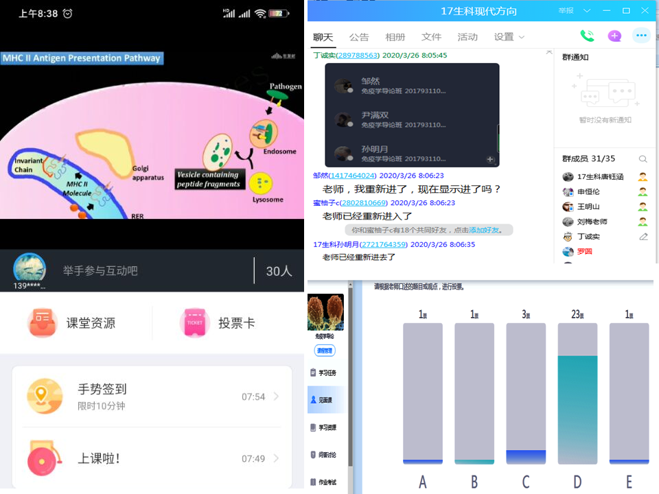 本学期生命科学学院丁诚实老师承担了2017级生物科学专业现代生物方向《免疫学导论》课程教学任务,这是一门专业知识深、应用技能强、与当下新冠病毒的检测、预防与治疗密切相关的课程。在疫情依然严峻的形势下,严格按照学校“停学不停课”的要求,他积极采用“智慧树平台+QQ课程群”开展在线教学。其典型做法如下: