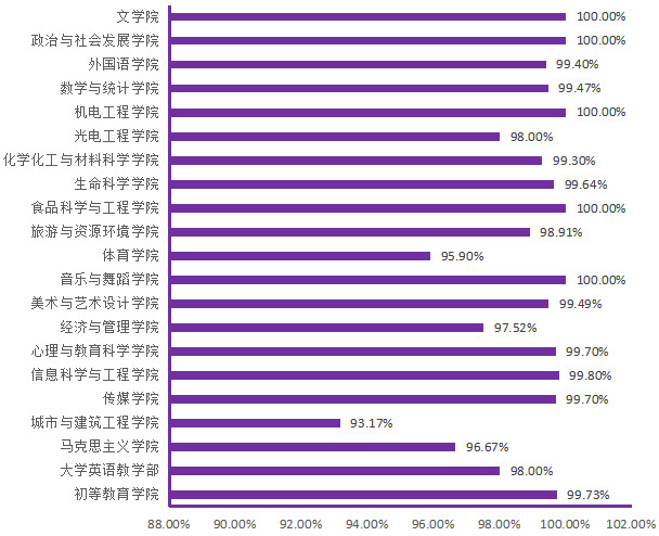 各院(部)的开课数、开课门次、班级数、教师数(人次)、学生数(人次)和学生上课率情况如下图所示: