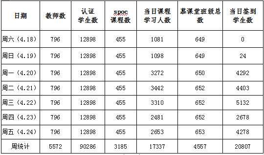 本周运行课程累计3185门次,上线教师数5572人次,认证学生数90286人次,当日课程学习累计17337人次,慕课堂班级总数4557。