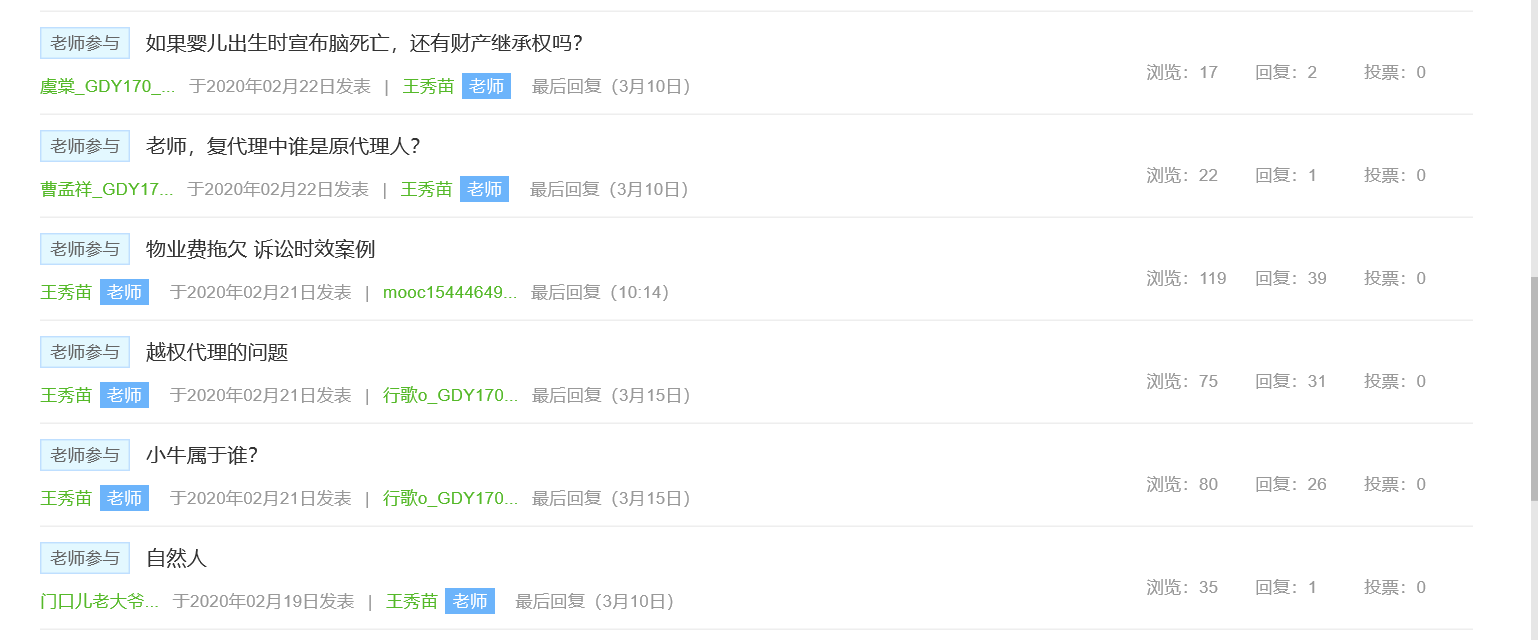 第一,课堂讨论。在异步SPOC《经济法》课程的讨论区,王秀苗老师发布了针对每章的主题案例,让同学们分析,同学们讨论非常热烈,效果不错。
