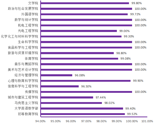 各院(部)的开课数、开课门次、班级数、教师数(人次)、学生数(人次)和学生上课率情况如下图所示:
