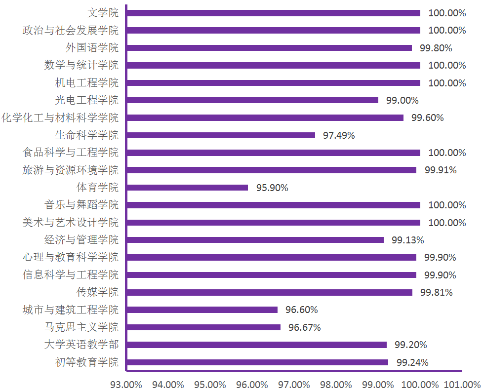 各院(部)的开课数、开课门次、班级数、教师数(人次)、学生数(人次)和学生上课率情况如下图所示: