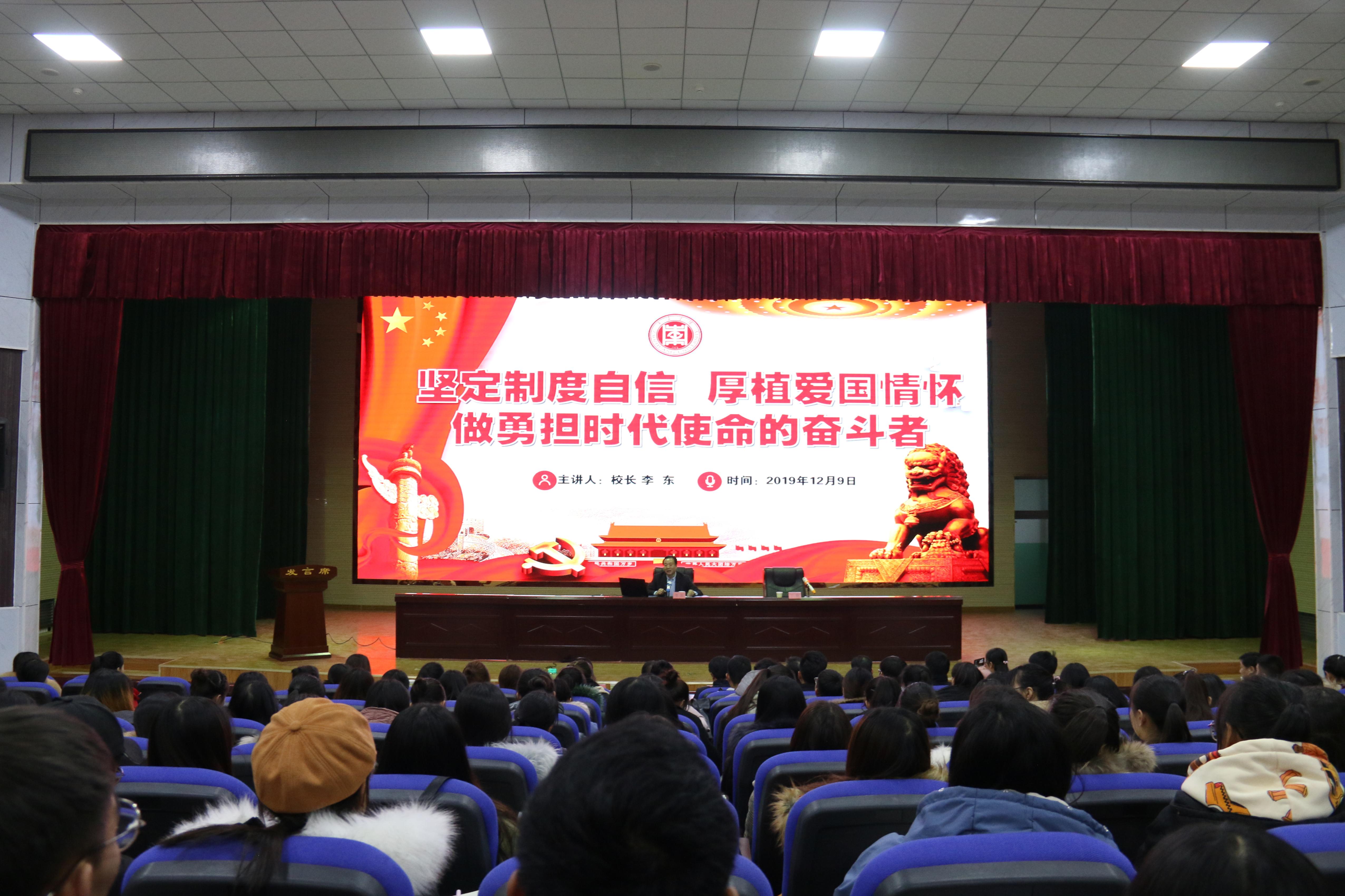 为深入学习贯彻党的十九届四中全会精神和《新时代爱国主义教育实施纲要》,进一步激发支教大学生的爱国情、报国志,12月9日党委副书记、校长李东以《坚定制度自信,厚植爱国情怀,做勇担时代使命的奋斗者》为题,在疏勒县东营第二小学报告厅为best365体育官网平台援疆实习支教团205位师生讲授了一堂精彩的思政课。山东省援疆工作指挥部党委副书记、喀什地委组织部副部长邓泽宇,东营市援疆工作指挥部党委书记、指挥、疏勒县委副书记曹永湖,山东省援疆指挥部干部人才组副组长、喀什地区教育局党组成员、副局长崔升平,东营市援疆工作指挥部财务民生组副组长、疏勒县教育局副局长李志福聆听了此次思政课。