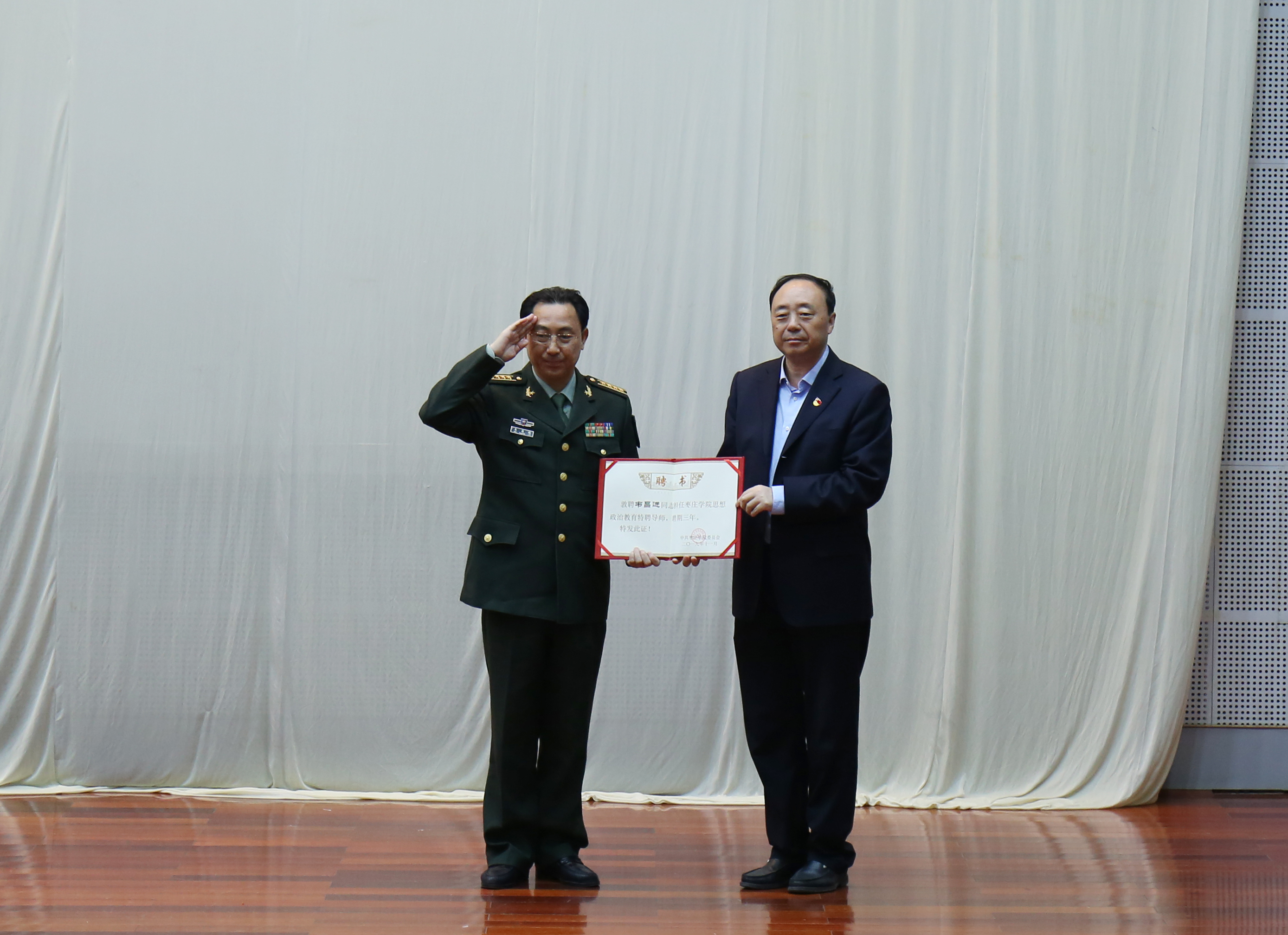 报告会前,校党委书记曹胜强代表学校向战斗英雄、首届“八一勋章”获得者韦昌进颁发聘书,隆重聘请韦昌进为best365官网思想政治教育特聘导师。
