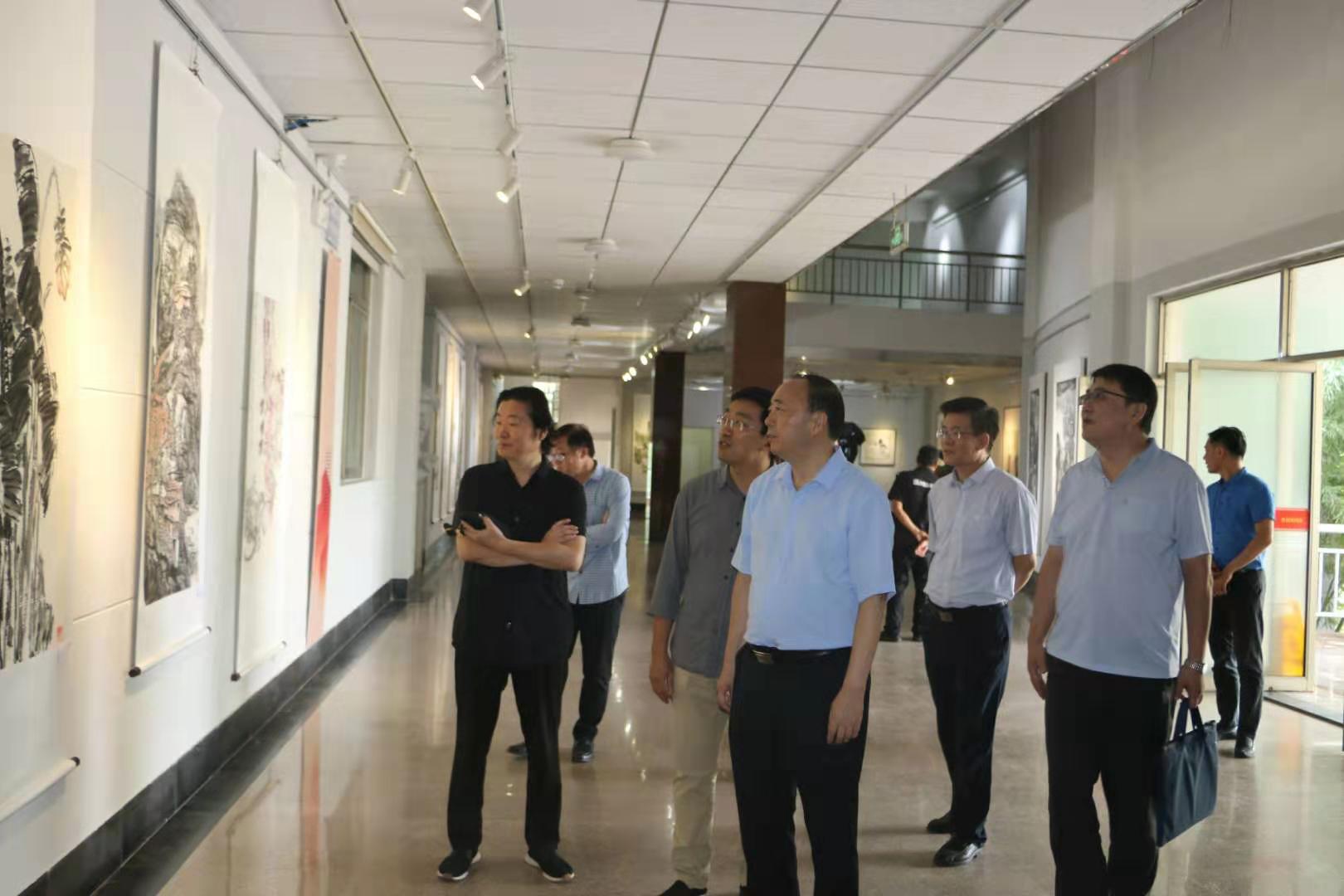 为庆祝新中国成立70周年,推动“不忘初心、牢记使命”主题教育深入开展,9月29日上午,学校党委统战部和美术与艺术设计学院联合枣庄市美术家协会,共同举办 “壮丽七十年,奋斗新时代”庆祝新中国成立70周年书画展。省委主题教育第二巡回指导组成员刘冬、张雷在校领导曹胜强、李东、曾宪明、明清河的陪同下一同参观了书画展。