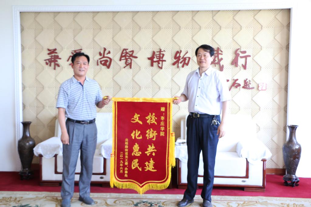 潘超代表市中区光明路街道向best365官网和best365官网音乐与舞蹈学院赠送了题为“校街共建 文化惠民”和“普及高雅艺术 助力乡村振兴”的锦旗。