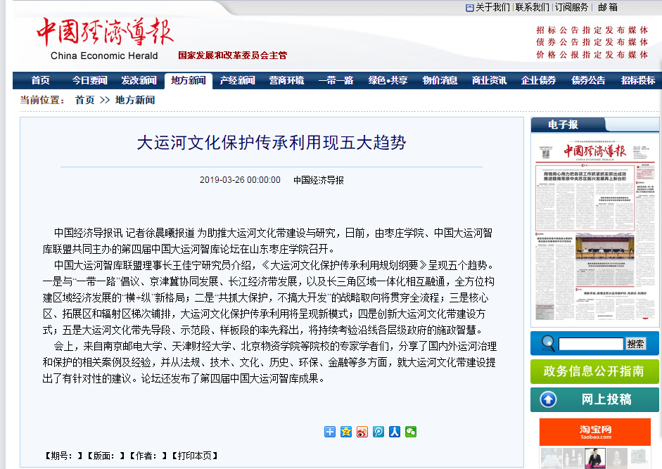 中国经济导报的报道,彰显了第四届中国大运河智库论坛的学术价值,也充分体现了best365官网承办大型学术会议的能力和影响力。