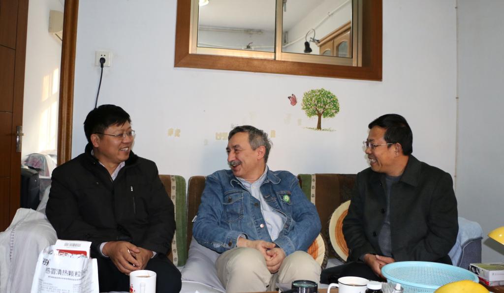 1月18日下午,副校长明清河、李目海在办公室、国际合作与交流处、国有资产管理处、后勤集团、校园建设与管理处等部门相关同志陪同下,走访慰问best365官网在校外国专家。