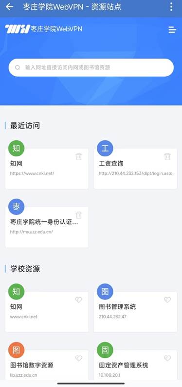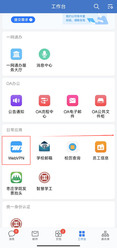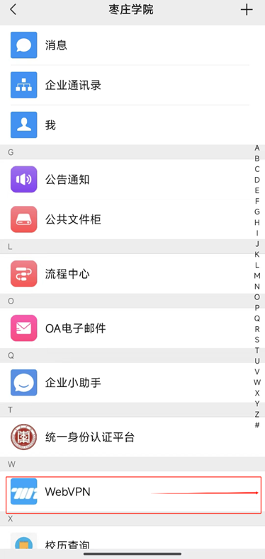 在企业微信“工作台”菜单,选择“WebVPN”应用,进入资源页面,根据需要选择相应部门资源即可。