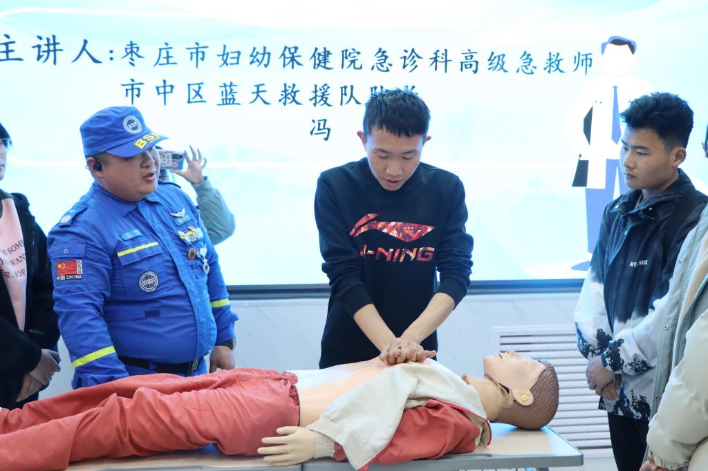 随后,冯琦以“自救互救及应急救护知识与技能培训”为主题,向同学们讲解了心肺复苏的重要性,分享了判断呼吸异常法,现场演示了心肺复苏急救法和海姆立克急救法,详细讲解每项操作的基本要领,通过“模拟人”进行现场演示。活动现场,冯琦邀请学生们上台实操,对操作中出现的不规范做法进行纠正,手把手教学,有效增强了同学们的急救意识,提高了应对突发事件和意外伤害的应变能力。