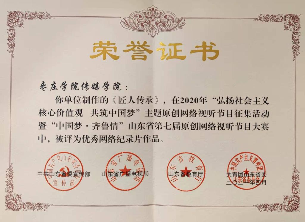 近日,由山东省委宣传部、山东省广播电视局、山东省教育厅、共青团山东省委共同组织发起的2020年“弘扬社会主义核心价值观,共筑中国梦”主题原创网络视听节目大赛落下帷幕。best365官网传媒学院教师王金军制作的系列纪录片《匠人传承》被评为山东省第七届原创网络视听节目大赛优秀网络纪录片。